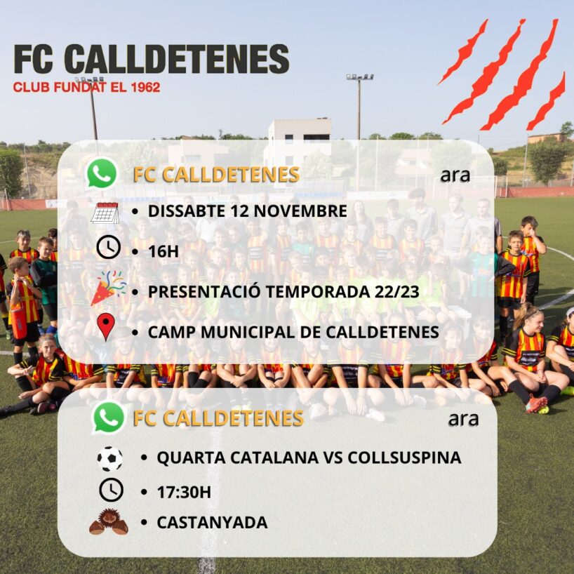 El proper dissabte 12 de novembre farem la presentació de futbol base.Els jugadors i jugadores estan convocats a les 16:00h al camp de futbol.Vestits amb la roba de partit: Samarreta de partit + pantalons negres + mitgetes negres…